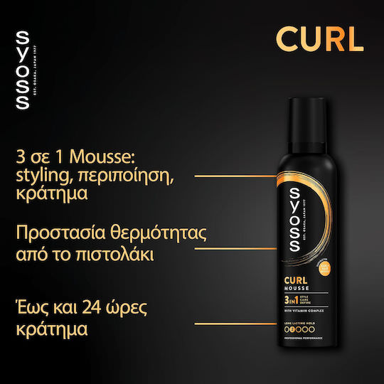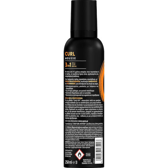 Το Syoss Curl Mousse προσφέρει καλοσχηματισμένες μακράς διάρκειας με ελαστικότητα μπούκλες. Με 3 σε 1 φόρμουλα styling, περιποίησης, επανόρθωσης, για χτενίσματα μεγάλης διάρκειας με υγιή όψη – με σύμπλεγμα βιταμινών, συνδυασμό πανθενόλης και νιασιναμίδης, για ενδυνάμωση της δομής της τρίχας. Παρέχει έως και 24 ώρες κράτημα και προστασία από την υγρασία και το φριζάρισμα, για φυσικό αποτέλεσμα.