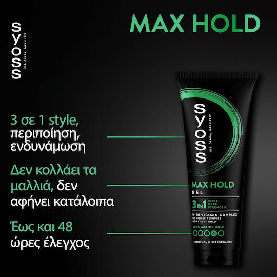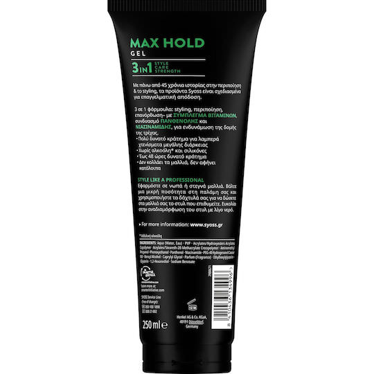 Το Syoss Max Hold Gel προσφέρει ευκολία στην διαμόρφωση και στο φορμάρισμα για χτενίσματα με extreme κράτημα. Με 3 σε 1 φόρμουλα styling, περιποίησης, επανόρθωσης, για χτενίσματα μεγάλης διάρκειας με υγιή όψη – με σύμπλεγμα βιταμινών, συνδυασμό πανθενόλης και νιασιναμίδης, για ενδυνάμωση της δομής της τρίχας. Δεν κολλάει τα μαλλιά και δεν αφήνει κατάλοιπα.