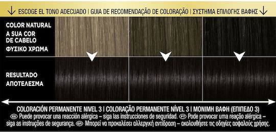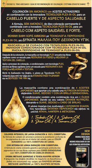 Μόνιμη βαφή με έλαια που δεν περιέχει αμμωνία για μέγιστη ένταση και διάρκεια χρώματος. Η φόρμουλα της βαφής περιέχει έλαια που βοηθάνε τα χρωστικά πιγκμέντα να διεισδύουν βαθιά στο εσωτερικό της τρίχας για μέγιστη ένταση και διάρκεια χρώματος, ενώ το περιποιητικό έλαιο Argan, γνωστό για τις ιδιότητες του, αφήνει τα μαλλιά απαλά, λαμπερά και μεταξένια. Προσφέρει εντατική περιποίηση μετά τη διαδικασία της βαφής για δυνατά μαλλιά που δείχνουν υγιή.