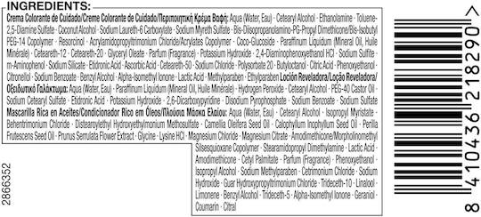 Hair Color/Toner, oxidative dyes:Aqua (Water, Eau),Cetearyl Alcohol,Ethanolamine,Coconut Alcohol,Sodium Laureth-6 Carboxylate,Sodium Myreth Sulfate,Glycine,Bis-Diisopropanolamino-PG-Propyl Dimethicone/Bis-Isobutyl PEG-14 Copolymer,Acrylamidopropyltrimonium Chloride/Acrylates Copolymer,Coco-Glucoside,Paraffinum Liquidum (Mineral Oil, Huile Minérale),Glyceryl Oleate,Parfum (Fragrance),Ceteareth-12,Ceteareth-20,Potassium Hydroxide,Sodium Sulfite,Sodium Silicate,Etidronic Acid,Ascorbic Acid,Sodium Chloride,Butyloctanol,Citric Acid,Polysorbate 20,Phenoxyethanol,Citronellol,Lactic Acid,Benzyl Alcohol,Alpha-Isomethyl Ionone,Sodium Benzoate,Methylparaben,Ethylparaben|:Aqua (Water, Eau),Cetearyl Alcohol,Quaternium-87,Propylene Glycol,Prunus Armeniaca (Apricot) Kernel Oil,Argania Spinosa Kernel Oil,Panthenol,Isopropyl Myristate,Distearoylethyl Hydroxyethylmonium Methosulfate,Citric Acid,Phenoxyethanol,Stearamidopropyl Dimethylamine,Polyquaternium-37,Ceteareth-20,Glyceryl Stearate,Sodium Methylparaben,Dicaprylyl Carbonate,Parfum (Fragrance),Hexyl Cinnamal,Benzyl Salicylate,Linalool,Lauryl Glucoside,Benzyl Alcohol,Limonene|Developer:Aqua (Water, Eau),Paraffinum Liquidum (Mineral Oil, Huile Minérale),Hydrogen Peroxide,Cetearyl Alcohol,PEG-40 Castor Oil,Sodium Cetearyl Sulfate,Etidronic Acid,Potassium Hydroxide,2,6-Dicarboxypyridine,Disodium Pyrophosphate,Sodium Benzoate,Sodium Sulfate.