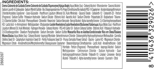 Hair Color/Toner, oxidative dyes:Aqua (Water, Eau),Cetearyl Alcohol,Ethanolamine,Coconut Alcohol,Sodium Laureth-6 Carboxylate,Sodium Myreth Sulfate,Glycine,Bis-Diisopropanolamino-PG-Propyl Dimethicone/Bis-Isobutyl PEG-14 Copolymer,Acrylamidopropyltrimonium Chloride/Acrylates Copolymer,Coco-Glucoside,Paraffinum Liquidum (Mineral Oil, Huile Minérale),Glyceryl Oleate,Parfum (Fragrance),Ceteareth-12,Ceteareth-20,Potassium Hydroxide,Sodium Sulfite,Sodium Silicate,Etidronic Acid,Ascorbic Acid,Sodium Chloride,Butyloctanol,Citric Acid,Polysorbate 20,Phenoxyethanol,Citronellol,Lactic Acid,Benzyl Alcohol,Alpha-Isomethyl Ionone,Sodium Benzoate,Methylparaben,Ethylparaben|:Aqua (Water, Eau),Cetearyl Alcohol,Quaternium-87,Propylene Glycol,Prunus Armeniaca (Apricot) Kernel Oil,Argania Spinosa Kernel Oil,Panthenol,Isopropyl Myristate,Distearoylethyl Hydroxyethylmonium Methosulfate,Citric Acid,Phenoxyethanol,Stearamidopropyl Dimethylamine,Polyquaternium-37,Ceteareth-20,Glyceryl Stearate,Sodium Methylparaben,Dicaprylyl Carbonate,Parfum (Fragrance),Hexyl Cinnamal,Benzyl Salicylate,Linalool,Lauryl Glucoside,Benzyl Alcohol,Limonene|Developer:Aqua (Water, Eau),Paraffinum Liquidum (Mineral Oil, Huile Minérale),Hydrogen Peroxide,Cetearyl Alcohol,PEG-40 Castor Oil,Sodium Cetearyl Sulfate,Etidronic Acid,Potassium Hydroxide,2,6-Dicarboxypyridine,Disodium Pyrophosphate,Sodium Benzoate,Sodium Sulfate.