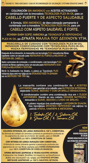 Μόνιμη βαφή με έλαια που δεν περιέχει αμμωνία για μέγιστη ένταση και διάρκεια χρώματος. Η φόρμουλα της βαφής περιέχει έλαια που βοηθάνε τα χρωστικά πιγκμέντα να διεισδύουν βαθιά στο εσωτερικό της τρίχας για μέγιστη ένταση και διάρκεια χρώματος, ενώ το περιποιητικό έλαιο Argan, γνωστό για τις ιδιότητες του, αφήνει τα μαλλιά απαλά, λαμπερά και μεταξένια. Προσφέρει εντατική περιποίηση μετά τη διαδικασία της βαφής για δυνατά μαλλιά που δείχνουν υγιή.