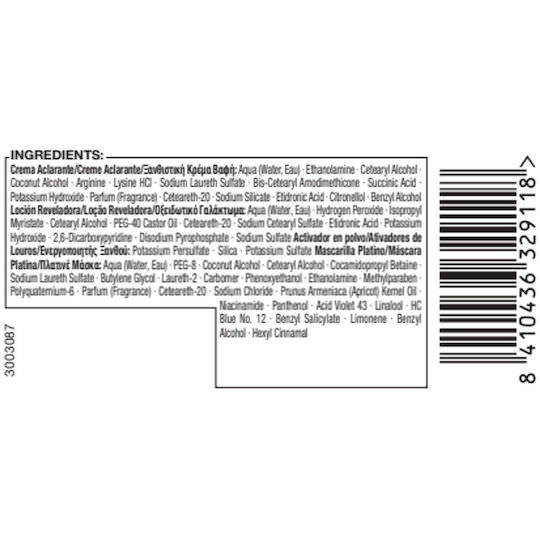 Hair Color/Toner, oxidative dyes:Aqua (Water, Eau),Cetearyl Alcohol,Ethanolamine,Coconut Alcohol,Sodium Laureth-6 Carboxylate,Sodium Myreth Sulfate,Glycine,Bis-Diisopropanolamino-PG-Propyl Dimethicone/Bis-Isobutyl PEG-14 Copolymer,Acrylamidopropyltrimonium Chloride/Acrylates Copolymer,Coco-Glucoside,Paraffinum Liquidum (Mineral Oil, Huile Minérale),Glyceryl Oleate,Parfum (Fragrance),Ceteareth-12,Ceteareth-20,Potassium Hydroxide,Sodium Sulfite,Sodium Silicate,Etidronic Acid,Ascorbic Acid,Sodium Chloride,Butyloctanol,Citric Acid,Polysorbate 20,Phenoxyethanol,Citronellol,Lactic Acid,Benzyl Alcohol,Alpha-Isomethyl Ionone,Sodium Benzoate,Methylparaben,Ethylparaben|:Aqua (Water, Eau),Cetearyl Alcohol,Quaternium-87,Propylene Glycol,Prunus Armeniaca (Apricot) Kernel Oil,Argania Spinosa Kernel Oil,Panthenol,Isopropyl Myristate,Distearoylethyl Hydroxyethylmonium Methosulfate,Citric Acid,Phenoxyethanol,Stearamidopropyl Dimethylamine,Polyquaternium-37,Ceteareth-20,Glyceryl Stearate,Sodium Methylparaben,Dicaprylyl Carbonate,Parfum (Fragrance),Hexyl Cinnamal,Benzyl Salicylate,Linalool,Lauryl Glucoside,Benzyl Alcohol,Limonene|Developer:Aqua (Water, Eau),Paraffinum Liquidum (Mineral Oil, Huile Minérale),Hydrogen Peroxide,Cetearyl Alcohol,PEG-40 Castor Oil,Sodium Cetearyl Sulfate,Etidronic Acid,Potassium Hydroxide,2,6-Dicarboxypyridine,Disodium Pyrophosphate,Sodium Benzoate,Sodium Sulfate.