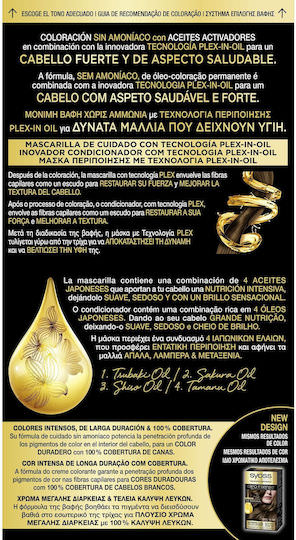 Μόνιμη βαφή με έλαια που δεν περιέχει αμμωνία για μέγιστη ένταση και διάρκεια χρώματος. Η φόρμουλα της βαφής περιέχει έλαια που βοηθάνε τα χρωστικά πιγκμέντα να διεισδύουν βαθιά στο εσωτερικό της τρίχας για μέγιστη ένταση και διάρκεια χρώματος, ενώ το περιποιητικό έλαιο Argan, γνωστό για τις ιδιότητες του, αφήνει τα μαλλιά απαλά, λαμπερά και μεταξένια. Προσφέρει εντατική περιποίηση μετά τη διαδικασία της βαφής για δυνατά μαλλιά που δείχνουν υγιή.