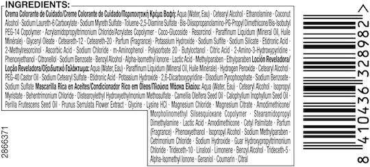 Hair Color/Toner, oxidative dyes:Aqua (Water, Eau),Cetearyl Alcohol,Ethanolamine,Coconut Alcohol,Sodium Laureth-6 Carboxylate,Sodium Myreth Sulfate,Glycine,Bis-Diisopropanolamino-PG-Propyl Dimethicone/Bis-Isobutyl PEG-14 Copolymer,Acrylamidopropyltrimonium Chloride/Acrylates Copolymer,Coco-Glucoside,Paraffinum Liquidum (Mineral Oil, Huile Minérale),Glyceryl Oleate,Parfum (Fragrance),Ceteareth-12,Ceteareth-20,Potassium Hydroxide,Sodium Sulfite,Sodium Silicate,Etidronic Acid,Ascorbic Acid,Sodium Chloride,Butyloctanol,Citric Acid,Polysorbate 20,Phenoxyethanol,Citronellol,Lactic Acid,Benzyl Alcohol,Alpha-Isomethyl Ionone,Sodium Benzoate,Methylparaben,Ethylparaben|:Aqua (Water, Eau),Cetearyl Alcohol,Quaternium-87,Propylene Glycol,Prunus Armeniaca (Apricot) Kernel Oil,Argania Spinosa Kernel Oil,Panthenol,Isopropyl Myristate,Distearoylethyl Hydroxyethylmonium Methosulfate,Citric Acid,Phenoxyethanol,Stearamidopropyl Dimethylamine,Polyquaternium-37,Ceteareth-20,Glyceryl Stearate,Sodium Methylparaben,Dicaprylyl Carbonate,Parfum (Fragrance),Hexyl Cinnamal,Benzyl Salicylate,Linalool,Lauryl Glucoside,Benzyl Alcohol,Limonene|Developer:Aqua (Water, Eau),Paraffinum Liquidum (Mineral Oil, Huile Minérale),Hydrogen Peroxide,Cetearyl Alcohol,PEG-40 Castor Oil,Sodium Cetearyl Sulfate,Etidronic Acid,Potassium Hydroxide,2,6-Dicarboxypyridine,Disodium Pyrophosphate,Sodium Benzoate,Sodium Sulfate.