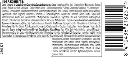 Hair Color/Toner, oxidative dyes:Aqua (Water, Eau),Cetearyl Alcohol,Ethanolamine,Coconut Alcohol,Sodium Laureth-6 Carboxylate,Sodium Myreth Sulfate,Glycine,Bis-Diisopropanolamino-PG-Propyl Dimethicone/Bis-Isobutyl PEG-14 Copolymer,Acrylamidopropyltrimonium Chloride/Acrylates Copolymer,Coco-Glucoside,Paraffinum Liquidum (Mineral Oil, Huile Minérale),Glyceryl Oleate,Parfum (Fragrance),Ceteareth-12,Ceteareth-20,Potassium Hydroxide,Sodium Sulfite,Sodium Silicate,Etidronic Acid,Ascorbic Acid,Sodium Chloride,Butyloctanol,Citric Acid,Polysorbate 20,Phenoxyethanol,Citronellol,Lactic Acid,Benzyl Alcohol,Alpha-Isomethyl Ionone,Sodium Benzoate,Methylparaben,Ethylparaben|:Aqua (Water, Eau),Cetearyl Alcohol,Quaternium-87,Propylene Glycol,Prunus Armeniaca (Apricot) Kernel Oil,Argania Spinosa Kernel Oil,Panthenol,Isopropyl Myristate,Distearoylethyl Hydroxyethylmonium Methosulfate,Citric Acid,Phenoxyethanol,Stearamidopropyl Dimethylamine,Polyquaternium-37,Ceteareth-20,Glyceryl Stearate,Sodium Methylparaben,Dicaprylyl Carbonate,Parfum (Fragrance),Hexyl Cinnamal,Benzyl Salicylate,Linalool,Lauryl Glucoside,Benzyl Alcohol,Limonene|Developer:Aqua (Water, Eau),Paraffinum Liquidum (Mineral Oil, Huile Minérale),Hydrogen Peroxide,Cetearyl Alcohol,PEG-40 Castor Oil,Sodium Cetearyl Sulfate,Etidronic Acid,Potassium Hydroxide,2,6-Dicarboxypyridine,Disodium Pyrophosphate,Sodium Benzoate,Sodium Sulfate.