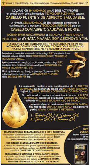 Μόνιμη βαφή με έλαια που δεν περιέχει αμμωνία για μέγιστη ένταση και διάρκεια χρώματος. Η φόρμουλα της βαφής περιέχει έλαια που βοηθάνε τα χρωστικά πιγκμέντα να διεισδύουν βαθιά στο εσωτερικό της τρίχας για μέγιστη ένταση και διάρκεια χρώματος, ενώ το περιποιητικό έλαιο Argan, γνωστό για τις ιδιότητες του, αφήνει τα μαλλιά απαλά, λαμπερά και μεταξένια. Προσφέρει εντατική περιποίηση μετά τη διαδικασία της βαφής για δυνατά μαλλιά που δείχνουν υγιή.