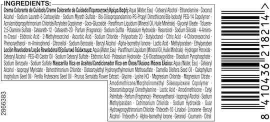 Hair Color/Toner, oxidative dyes:Aqua (Water, Eau),Cetearyl Alcohol,Ethanolamine,Coconut Alcohol,Sodium Laureth-6 Carboxylate,Sodium Myreth Sulfate,Glycine,Bis-Diisopropanolamino-PG-Propyl Dimethicone/Bis-Isobutyl PEG-14 Copolymer,Acrylamidopropyltrimonium Chloride/Acrylates Copolymer,Coco-Glucoside,Paraffinum Liquidum (Mineral Oil, Huile Minérale),Glyceryl Oleate,Parfum (Fragrance),Ceteareth-12,Ceteareth-20,Potassium Hydroxide,Sodium Sulfite,Sodium Silicate,Etidronic Acid,Ascorbic Acid,Sodium Chloride,Butyloctanol,Citric Acid,Polysorbate 20,Phenoxyethanol,Citronellol,Lactic Acid,Benzyl Alcohol,Alpha-Isomethyl Ionone,Sodium Benzoate,Methylparaben,Ethylparaben|:Aqua (Water, Eau),Cetearyl Alcohol,Quaternium-87,Propylene Glycol,Prunus Armeniaca (Apricot) Kernel Oil,Argania Spinosa Kernel Oil,Panthenol,Isopropyl Myristate,Distearoylethyl Hydroxyethylmonium Methosulfate,Citric Acid,Phenoxyethanol,Stearamidopropyl Dimethylamine,Polyquaternium-37,Ceteareth-20,Glyceryl Stearate,Sodium Methylparaben,Dicaprylyl Carbonate,Parfum (Fragrance),Hexyl Cinnamal,Benzyl Salicylate,Linalool,Lauryl Glucoside,Benzyl Alcohol,Limonene|Developer:Aqua (Water, Eau),Paraffinum Liquidum (Mineral Oil, Huile Minérale),Hydrogen Peroxide,Cetearyl Alcohol,PEG-40 Castor Oil,Sodium Cetearyl Sulfate,Etidronic Acid,Potassium Hydroxide,2,6-Dicarboxypyridine,Disodium Pyrophosphate,Sodium Benzoate,Sodium Sulfate.