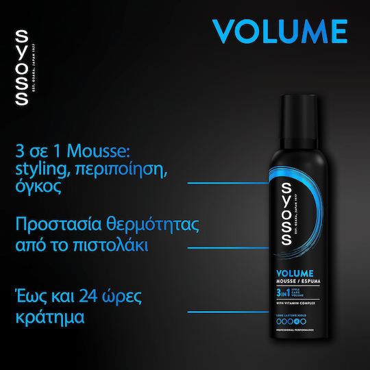 Το Syoss volume mousse προσφέρει όγκο για εντυπωσιακά χτενίσματα με μεγάλη διάρκεια. Με 3 σε 1 φόρμουλα styling, περιποίησης, επανόρθωσης, για χτενίσματα μεγάλης διάρκειας με υγιή όψη – με σύμπλεγμα βιταμινών, συνδυασμό πανθενόλης και νιασιναμίδης, για ενδυνάμωση της δομής της τρίχας. Παρέχει έως και 24 ώρες κράτημα και προστασία από την υγρασία και το φριζάρισμα, για φυσικό αποτέλεσμα.