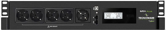 Το ERA PLUS Mini UPS Line-Interactive 1200VA 840W με 5 Schuko Πρίζες της Tecnoware είναι ένα Rack UPS με 5 πρίζες τύπου Schuko. Η λειτουργία του είναι (VI) Line-Interactive που προσαρμόζει την τάση εξόδου συνεχώς μέσω αυτόματου ρυθμιστή τάσης προστατεύοντας από αυξομειώσεις της τάσης και διακοπές του ρεύματος. Η μπαταρία του μπορεί να κρατήσει 10 λεπτά με πλήρες φορτίο (όταν οι συσκευές που έιναι συνδεδεμένες τραβάνε το μέγιστο ρεύμα που μπορεί να δώσει το UPS).