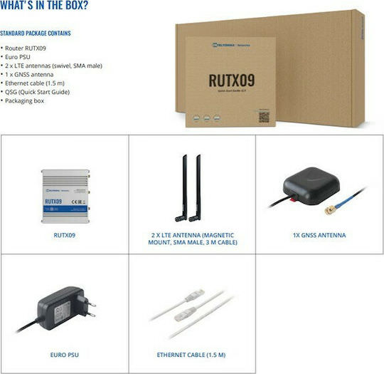 Το RUTX09 της Teltonika είναι ένα 4G router επόμενης γενιάς το οποίο υποστηρίζει LTE Cat6 μέχρι και 300 Mbps. Είναι ανθεκτικό και κατάλληλο για βιομηχανικές εφαρμογές υψηλών απαιτήσεων με 4 Gibabit Ethernet θύρες.