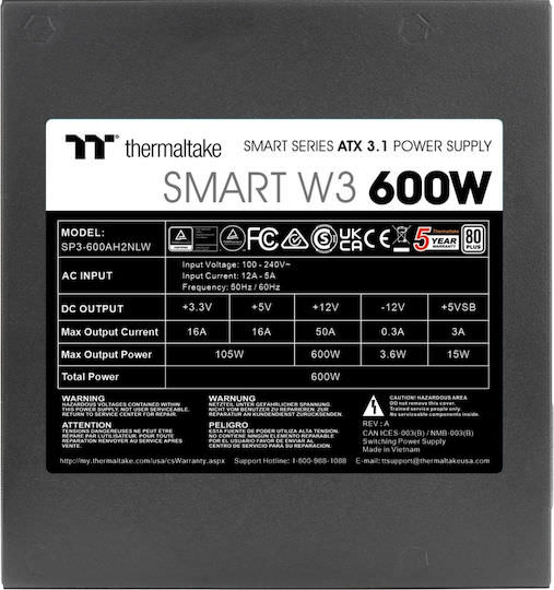 Thermaltake Smart W3 600W Μαύρο Τροφοδοτικό Υπολογιστή Full Wired 80 Plus Standard