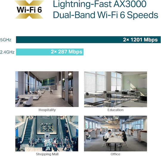 Σχεδιασμένο για επαγγελματικά περιβάλλοντα που απαιτούν WiFi υψηλής απόδοσης. Lightning-Fast AX3000 WiFi 6 ταχυτήτων. Το επιχειρηματικό WiFi 6 νέας εποχής με ταχύτητες έως και 2976 Mbps φέρνει πάνω από διπλάσια ταχύτητα από το WiFi 5. Κάθε εφαρμογή έχει μεγαλύτερη αίσθηση ροής με δραστικά βελτιωμένες ταχύτητες WiFi. Εύκολη τοποθέτηση με εκλεπτυσμένο βιομηχανικό σχέδιο.