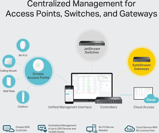 Κεντρική διαχείριση για έως και 500 σημεία πρόσβασης Omada, JetStream switches και SafeStream routers.