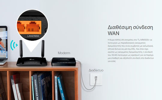 Η θύρα WAN / LAN επιτρέπει στο TL-MR6500v να λειτουργεί ως παραδοσιακός ασύρματος δρομολογητής που είναι συμβατός με καλώδια, ίνες και μόντεμ DSL. Και όταν έχει οριστεί ως ασύρματος δρομολογητής, η σύνδεσή του 3G / 4G λειτουργεί ως αντίγραφο ασφαλείας για να παρέχει μια συνεχή και αξιόπιστη σύνδεση στο διαδίκτυο για εσάς.