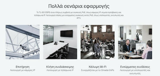 Το TL-SG105PE είναι πλήρως συμβατό με συσκευές PoE, όπως κάμερες IP, σημεία πρόσβασης και τηλέφωνα IP. Λειτουργεί επίσης με ενσύρματες συσκευές εκτός PoE, όπως υπολογιστές, εκτυπωτές και IPTV.