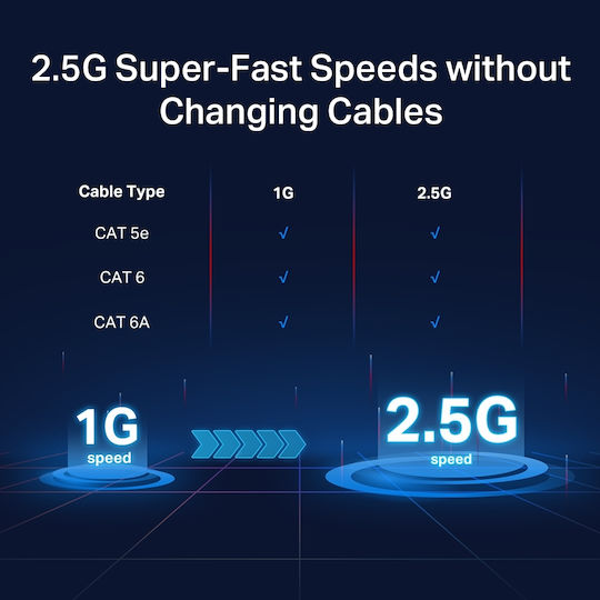 Ως η ναυαρχίδα των προϊόντων 2,5G, οι επιτραπέζιοι μεταγωγείς 5/8 θυρών με 5/8× θύρες 2,5-Gigabit ξεκλειδώνουν την υψηλότερη απόδοση του εύρους ζώνης Multi-Gig και των συσκευών σας και παρέχουν χωρητικότητα μεταγωγής έως και 25/40 Gbps. Οι συνδέσεις αυτόματης διαπραγμάτευσης 3 ταχυτήτων (100Mb/1G/2.5G) ανιχνεύουν τις ταχύτητες σύνδεσης και προσαρμόζονται έξυπνα για συμβατότητα και βέλτιστη απόδοση για όλες τις συσκευές σας, συμπεριλαμβανομένων των NAS 2.5G, του προσαρμογέα PCIe 2.5G, της κονσόλας παιχνιδιών, του VR gaming, του WiFi 6 AP 2.5G, του βίντεο 4K, του επιτραπέζιου υπολογιστή και άλλων.