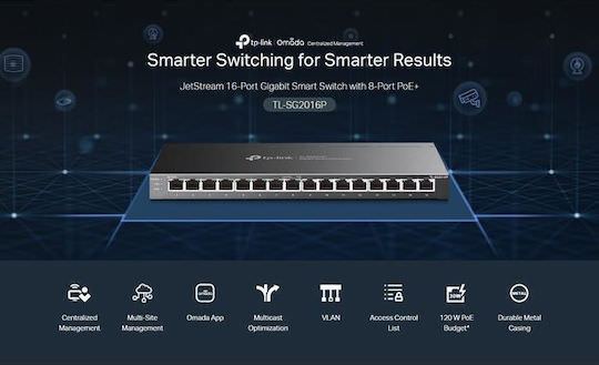 – 16 Θύρες: 8x PoE+, 8x RJ45
