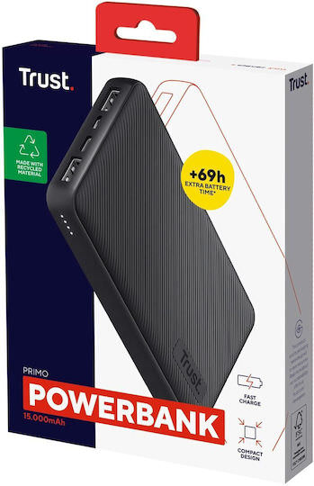 Trust Primo Power Bank 15000mAh 15W με 2 Θύρες USB-A και Θύρα USB-C Μαύρο