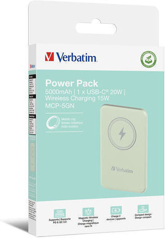 Power Bank Verbatim Charge n Go 5000mAh Magnetic Wireless Green 32241, για ασφαλείς και γρήγορες φορτίσεις.