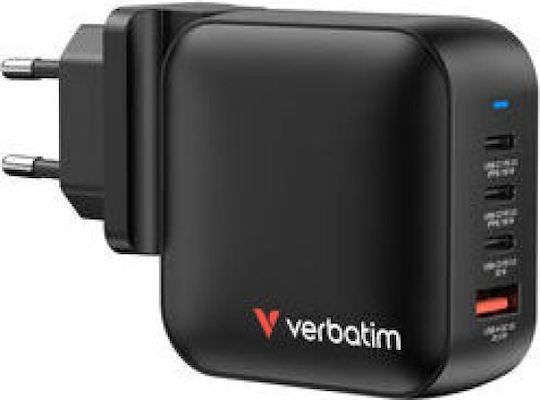 Verbatim Φορτιστής Χωρίς Καλώδιο GaN με Θύρα USB-A και 3 Θύρες USB-C 100W Power Delivery / Quick Charge 3.0 Μαύρος (Mini)
