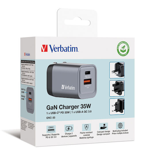 Verbatim Φορτιστής Χωρίς Καλώδιο GaN με Θύρα USB-A και Θύρα USB-C 35W Power Delivery / Quick Charge 3.0 Γκρι (GNC-35)