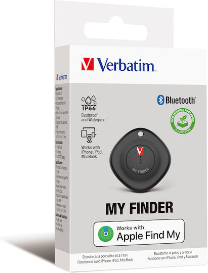 Το My Finder της Verbatim είναι μια συσκευή εντοπισμού που λειτουργεί αποκλειστικά με την εφαρμογή “Find My” της Apple. Απλώς κρεμάστε το Verbatim My Finder σε οποιοδήποτε αντικείμενό σας επιθυμείτε να παρακολουθείτε και εντοπίστε το μέσω της εφαρμογής “Find My” στο iPhone, το iPad ή το MacBook σας., Παραπεταμένες τσάντες, κλειδιά και άλλα πολύτιμα αντικείμενα, ανήκουν στο παρελθόν με τη συσκευή Bluetooth εντοπισμού My Finder της Verbatim., Στη λειτουργία “Lost Mode” της εφαρμογής “Find My” της Apple, μπορείτε να εισαγάγετε τα στοιχεία επικοινωνίας σας σε περίπτωση που το αντικείμενό σας εντοπιστεί από κάποιον άλλο στο χρήστη της εφαρμογής “Find My”., Χρησιμοποιώντας το οικοσύστημα Apple Find My, μπορείτε εύκολα να εντοπίσετε την τοποθεσία του αντικειμένου σας. Εάν βρίσκεστε σε κοντινή απόσταση, επιλέξτε την «Αναπαραγωγή ήχου» στην εφαρμογή και ακολουθήστε το ηχητικό σήμα για να βρείτε το χαμένο σας αντικείμενο. Εναλλακτικά, επιλέξτε το στοιχείο που αναζητάτε στην εφαρμογή και εντοπίστε το στον χάρτη. Η όλη διαδικασία είναι ανώνυμη και κρυπτογραφημένη για την προστασία του απορρήτου σας., Η συσκευή είνα περιέχει μπαταρία λιθίου με διάρκεια ζωής δώδεκα (12) μήνες, ώστε να μην χρειάζονται συχνές αλλαγές μπαταρίας. Επίσης, το MY Finder έχει προστασία IP66 που το καθιστά ανθεκτικό στο νερό και τη σκόνη.