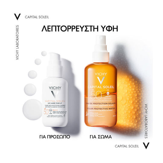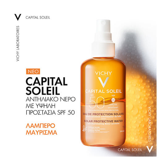 Το Capital Soleil Solar Protective Water προσφέρει υψηλή αντηλιακή προστασία που αφήνει στην επιδερμίδα αίσθηση καθαριότητας. Δεν κολλάει και δεν αφήνει λευκά σημάδια. Σύνθεση εμπλουτισμένη με φυτικής προέλευσης β-καροτένιο που βελτιώνει την ομοιομορφία της επιδερμίδας και βελτιστοποιεί το μαύρισμα.