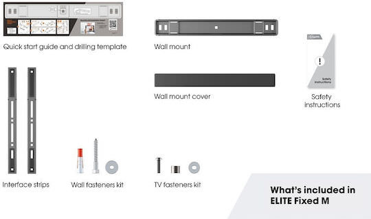 Περιεχόμενα συσκευασίας: Επιτοίχια βάση, κιτ επιτοίχιας τοποθέτησης με βύσματα fischer® Duo Power, κιτ συνδετήρων τηλεόρασης, Spirit level, Οδηγός γρήγορης εγκατάστασης, εφαρμογή DrillRight™ AR, Πρότυπο διάτρησης